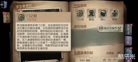 3、祭司现在开局就有一个门之钥,不用等时间冷却,因此即使开局遇到监管者也不用非常担心,只要绕着门之钥就可以。如果监管者选择拆除门之钥,那么祭司可以立刻远离,跟监管者拉开一定距离。