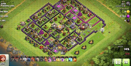 战车有别于飞艇,它最突出的作用就是攻坚穿墙,之前需要多个法术和炸弹才能解决的陆军进中问题迎刃而解。我们采用天女流搭配攻城战车在实战中试验一下。我们这次选择了一个速十一本进行攻击。先下女王用天使奶住进行外围清理,然后下攻城战车破墙进中,由于外围清理较好女王会及时跟紧战车进中持续清理,我们看到在不触发天鹰火炮时,一个空战车加上天女就能接近核心防御层,带走一根地狱塔和一个天鹰火炮。根据图中情况,即使战车是空的。后续武神皮卡加法师的搭配也能顺利进中,并在狂暴的加持下,轻松清理所有核心防御。再用治疗法术保证部队的续航后,摧毁所有建筑也是易如反掌。