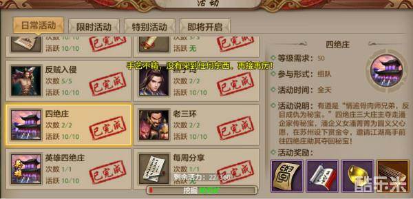 四绝庄副本参加等级是50级,需要小伙伴们组队参加,副本奖励为手工装备的打造符,打造图,珍贵的跑环道具焦尾琴,强化打造材料。这个副本的难度普通,所以小伙伴们参加的时候最好要组满五个人。