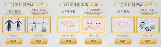 1月1日—1月31日期间,累计消费满188、288、388元,便可领取对应道具。