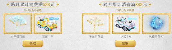 1月1日—2月28日内消费达到588、888元,2月5日开始便可领取对应道具。