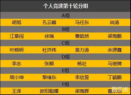 再次恭喜胡旭、马任东、曹皓然、袁力涛、杨壮、李欣昱六位选手,在第九轮的个人比赛中获得小组第一。江章闯痛失A组比赛资格,胡旭、孔云峰继续守卫成功,下周的比赛,小组成员又会发生怎样的变化?让我们继续期待下周四下午1点,虎牙直播进行的组队竞速第四轮的比赛!