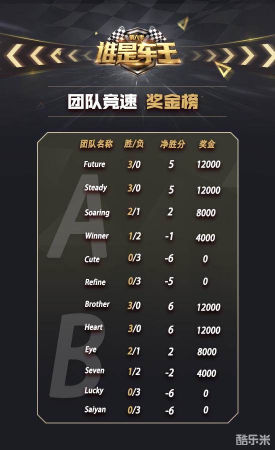A、B两组奖金榜情况相似,前两名均是3胜0败。由杜洪伟和尚涛组成的Future战队,由张顺和黎绪东组成的Sterdy战队,由余源鑫和马任东组成的Brother战队和由江章闯和孔云峰组成的Heart战队奖金金额相同,领跑奖金榜。除了余源鑫,其他这几位都是场上的老将,这说明老将的实力依旧雄厚。