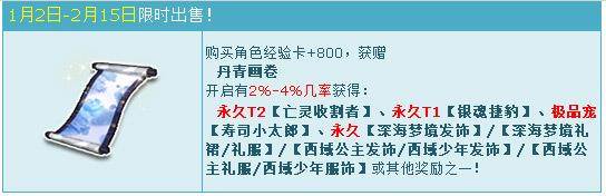 1月2日-2月15日购买角色经验卡+800,获赠:丹青画卷,开启有几率获得:永久T2【亡灵收割者】、永久T1【银魂捷豹】、极品宠【寿司小太郎】、永久【深海梦境发饰】/【深海梦境礼裙/礼服】/【西域公主发饰/西域少年发饰】/【西域公主礼服/西域少年服饰】或其他奖励之一!获得核心奖励永久型概率是:2%-4%,获得核心奖励期限型概率是:4%-6%,获得非核心奖励概率是:90%-94%。