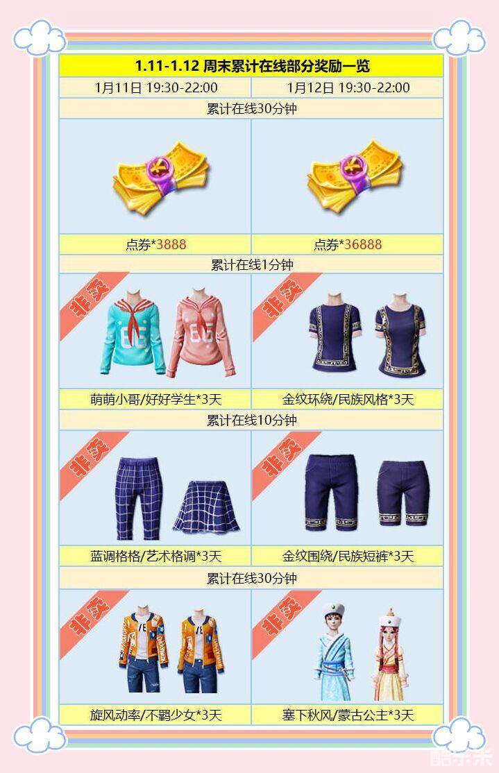 1.11-1.12晚上19:30-22:00,累计在线1分钟、10分钟和30分钟,就能轻松获得随机非卖服饰+套装,另外还有40776点券赠送哦~