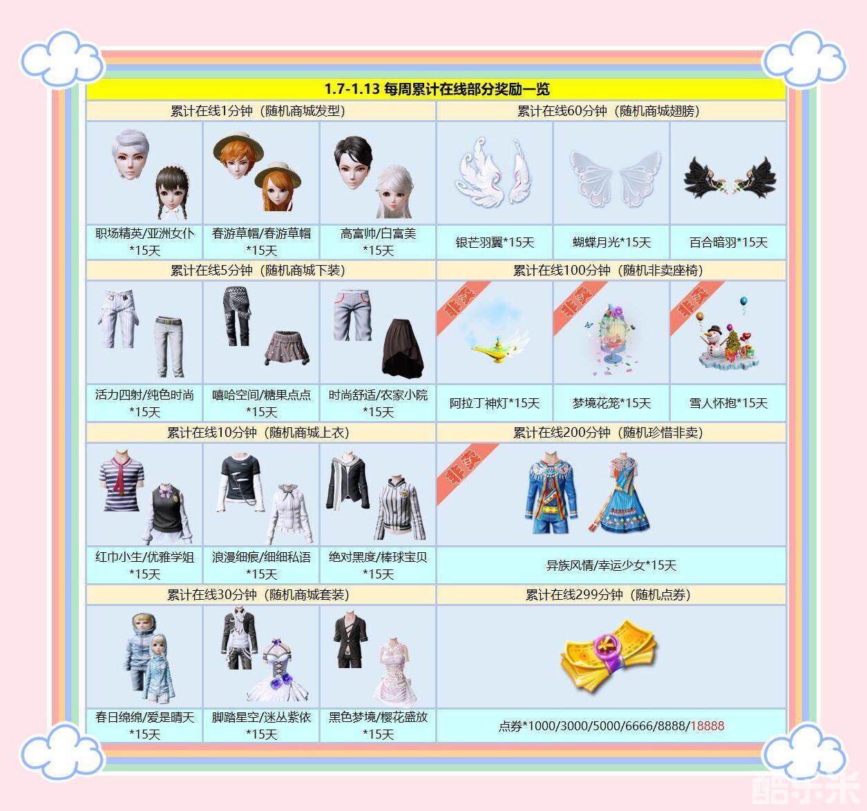 周内累计在线1分钟、5分钟、10分钟、30分钟、60分钟、100分钟、200分钟、299分钟,商城金币服饰以及非卖座椅,统统送给可爱的你,助你迎接新的一年!