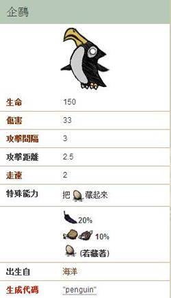 饥荒好优雅的鸟,企鹅属性全面分析。在饥荒游戏中企鹅属于攻击会还手的重力生物。在游戏中,冬天到来之后,企鹅会一次大约七只的出现在海边,它们会一直呆在海边繁殖知道冬天的结束。而且只有玩家靠近海边的时候,企鹅才会从海中跳上岸。下面就给大家介绍一下企鹅的属性吧。