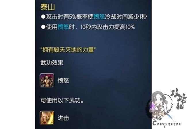 在泰山特性下,攻击时有5%概率使愤怒冷却时间减少1秒;使用愤怒时,10秒内攻击力提高10%;愤怒发动期间,强化能力值,可使用怒扫。