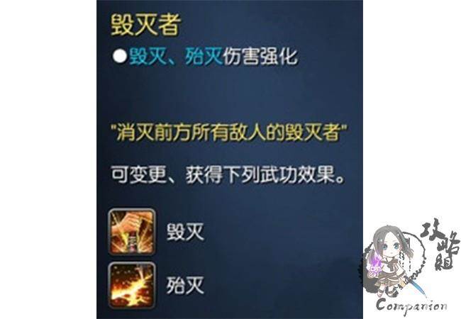 毁灭者的特性修炼下,毁灭和殆灭这两个泰山力士的基本输出武功的伤害数值提升。因在同排的其他特性里天崩地裂武功的属性得到变更,此特性不管在PVE还是在PVP中或许都将会是部分玩家的首选。
