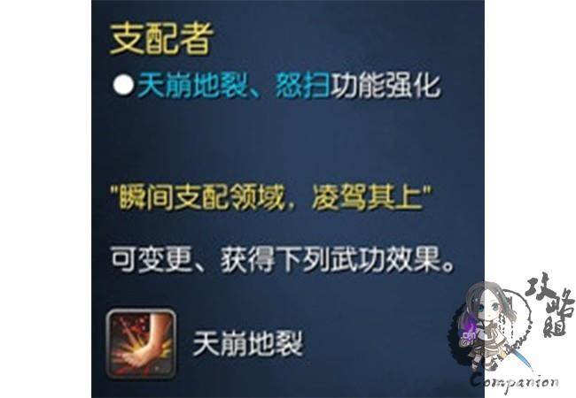 支配者的特性修炼下,天崩地裂武功造成的伤害提高,新增领域内可以使用怒扫。怒扫作为力士的核心武功之一,在实战中是经常需要使用的,此特性适用于PVE和个人挑战中选择修炼。