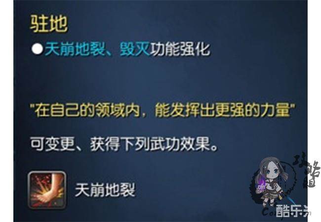 驻地的特性修炼下,天崩地裂武功新增领域内,怒扫武功伤害提高20%;新增领域内,毁灭、殆灭武功伤害量提高45%。在PVE和个人挑战中选择这一特性修炼,泰山力士可以打出成吨的伤害。