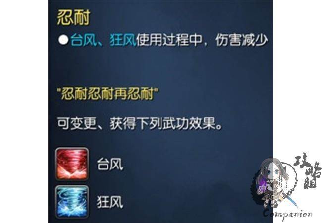 忍耐的特性修炼下,台风武功新增可连续使用;新增伤害减免25%;新增5次命中后眩晕2秒;新增命中时,进入韧性状态;新增在韧性状态下,最大内力增加100。狂风武功新增伤害减免25%。适用于PVE和各种复杂的战斗场景。