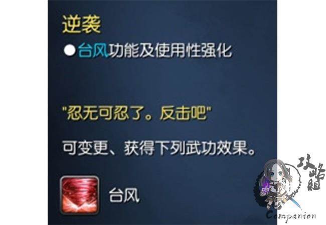 逆袭的特性修炼下,台风武功新增最多连续施展4次;施展状态下,移动速度降低30%;新增命中后,击退11米后倒地2秒效果;新增命中后,解除靠近武功封锁。想起近两年在剑灵比武大赛中,击退台风配合队友秒杀对手的震撼时刻仍旧历历在目。故此,在比武车轮战中选择这一特性修炼用于配合队友准没错的。