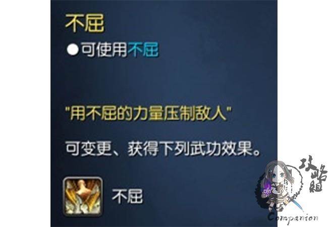 不屈的特性修炼下,可以使用不屈。施展不屈武功后,5秒内不屈效果;在5秒内抵抗5次伤害和异常状态;不屈状态下,恢复150内力;不屈状态下无视减速、无法移动等效果;解除眩晕、虚弱状态。这一特性的武功让力士得以成为“双解控职业”,常见于PVP中使用。