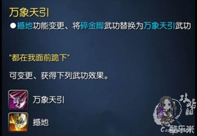 万象天引的特性修炼下,碎金脚变更为万象天引武功,新增将目标拉近后将其虚弱3秒效果,新增反制穿刺效果。撼地武功的伤害量提升,新增将范围目标拉近后将其虚弱2秒效果,新增反制穿刺效果。这一特性修炼常见于PVP和个人挑战中使用。