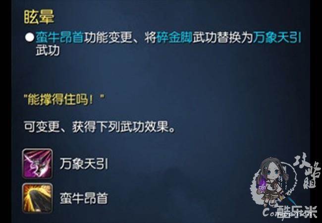 眩晕的特性修炼下,碎金脚变更为万象天引武功,新增将范围目标拉近后将其虚弱2秒,新增反制穿刺效果。蛮牛昂首武功施展距离增至8米,冷却时间由30秒变为24秒,新增倒地2秒效果,新增向敌人突进,新增解除靠近武功封锁,新增反制穿刺效果。选择此特性修炼后,在PVP时可以远距离使用蛮牛昂首控制敌人,不需要锁定目标亦可施展万象天引武功;在PVE时可以使用万象天引聚集范围内的小怪便于击杀。
