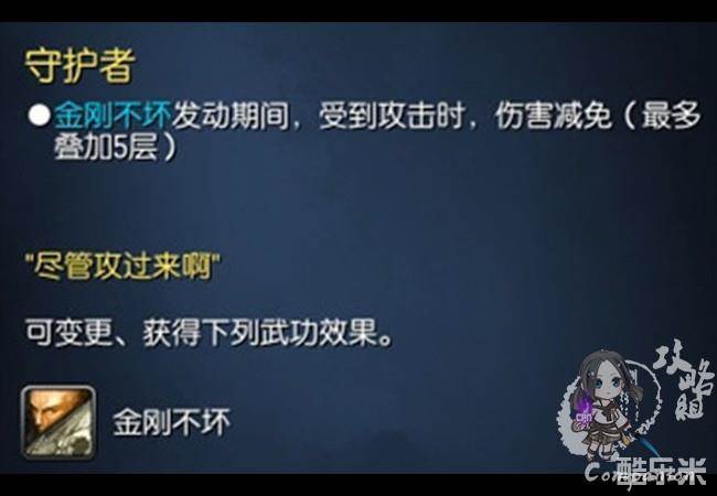 守护者的特性修炼下,金刚不坏武功在4秒内格挡前方攻击;新增伤害减少40%;新增无畏打击命中后,金刚不坏冷却时间降低1秒;4秒内恢复5%生命;新增金刚不坏发动期间,受到攻击后5秒内伤害减免10%(最多叠加5层);范围目标变为单体目标,冷却时间由30秒变为12秒,可以向自己与队员赋予3秒铁花效果。金刚不坏是力士的经典武功之一,常见于PVE和个人挑战中使用。