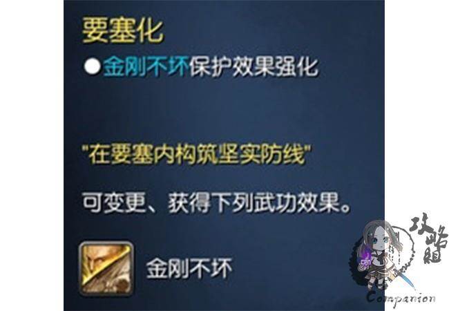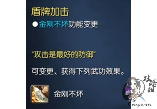 盾牌加击的特性修炼下,金刚不坏武功在4秒内格挡前方攻击,新增附带一定数额的伤害;新增眩晕3秒效果,新增防御、反制穿刺效果,在4秒内恢复20%的生命,单体目标变为范围目标,冷却时间由12秒变为45秒。此特性在PVP和PVE中用于控制或者组合控制敌人将会是一个不错的选择。