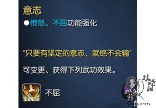 意志的特性修炼下,愤怒武功愤怒效果时间由6秒变更为为8秒,愤怒状态下恢复内力由180变为300;不屈武功不屈效果时间由5秒变更为7秒,不屈状态下恢复内力由150变为210。PVE、PVP和各种复杂的战斗场景都很适用。