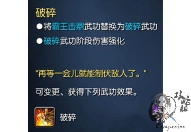 破碎的特性修炼下,霸王击鼎武功变为全新武功破碎。破碎是一个可以蓄力施展的武功,最多可维持2.4秒,施展时可使用1段破碎,2段、3段破碎造成的伤害成倍增加,3段破碎命中时解除防御。并且破碎武功还拥有防御、反制穿刺的效果,PVE和PVP中都可以选择这一特性修炼。