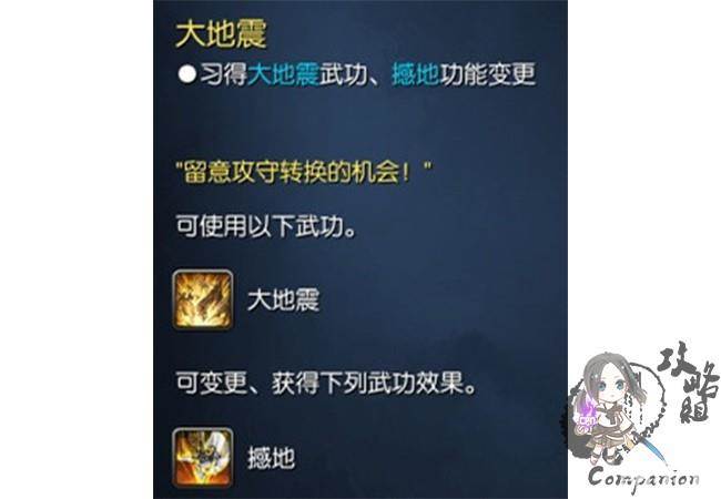 大地震的特性修炼下,撼地武功新增抵抗伤害和异常状态并且造成的伤害增加,每名中1个敌人造成的50%的伤害转化为生命,每名中1个敌人恢复20内力,16米突进,神行跳跃、乘风状态下施展后防御、反制穿刺。