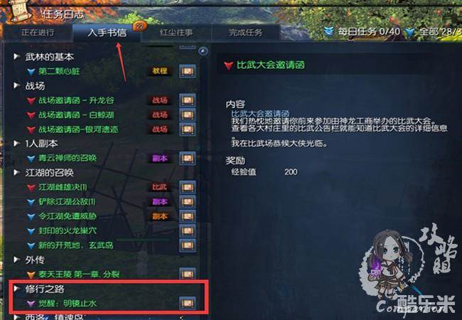 按J打开任务-入手书信,可以看到紫色的书信-觉醒:明镜止水