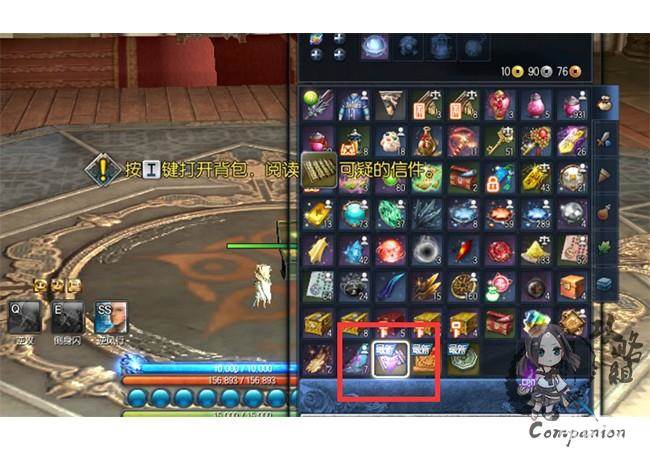 注入内力后箱子打开,我们得到一封可疑的信件,系统提示按I键打开包裹阅读书信;打开包裹后看到包里有个紫色箭头的任务道具。