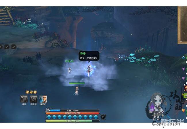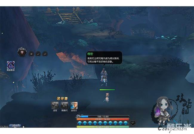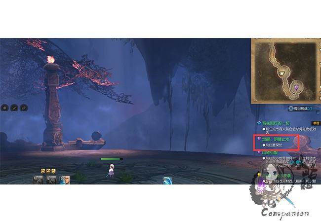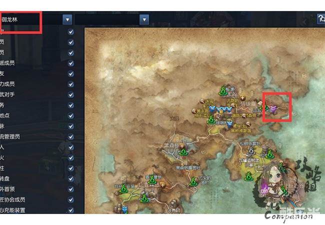 右键查看地图后,陈苏儿给出了提示,打开地图后我们发现紫色的箭头在御龙林情缘崖附近
