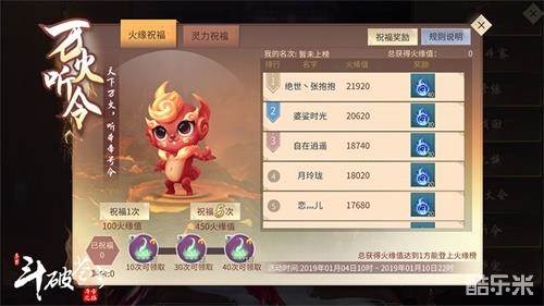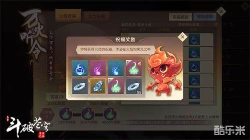 斗者在祝福进行了10次、20次和30次时,可分阶段获取数量不同的青莲地心火?子残焰奖励,而最终根据斗者累计获得的火缘值会进行排名,排名1-10的斗者将获得数量不同的灵力丹奖励。