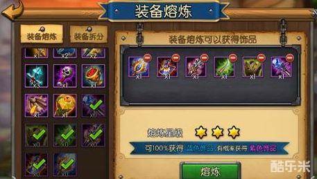 召唤师可以在左侧的装备栏中随意选择不同品质的装备进行熔炼,选择的装备越多品阶越高(紫色-蓝色-绿色-白色)产出高品质饰品的概率就越大,当然消耗的金币也越多。