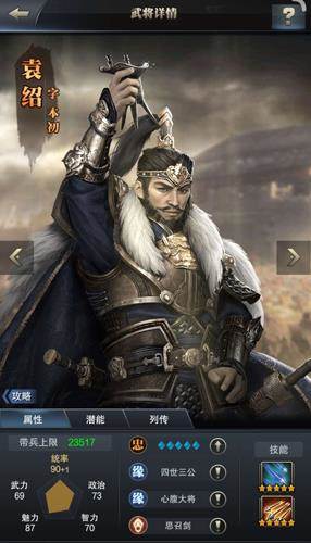 从五维属性上看,作为一个弓兵统率橙将,袁绍的初始统率值就达到了90。同时,袁绍拥有的两个技能对弓兵攻击力均有十分强劲的增益。第一个技能“奋起•弓”能提升所在部队弓兵20%攻击力,第二个技能“无双•弓”能提升所在军团弓兵10%攻击力。考虑到目前弓兵盛行的主流配置,袁绍还是具有一定优势的。