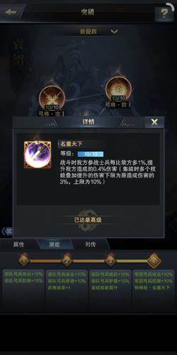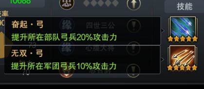 袁绍本身已拥有两个强力的弓兵攻击技能,而在突破后,他的技能属性也得到了进一步加强。四阶突破完成后,可以增强部队弓兵攻击和防御属性15%,增强部队弓兵连击、穿透、抵抗、护盾属性10%,增强军团弓兵攻击和防御属性10%,还额外增加1点统率属性值和两项初始技能10%的效果。总体而言,袁绍突破后对弓兵军团的攻防属性加成比较全面,实用性十足。