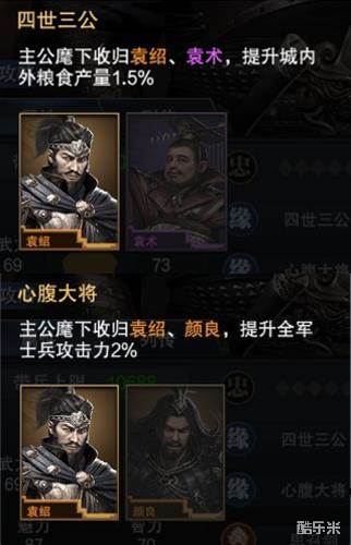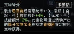 从缘分搭配上看,主公们可以通过活动产出的缘分宝物宝图或鉴物所获得思召剑,给袁绍装备后可提升其10点统率值,技能“奋起•弓”获得额外加成4%,“无双•弓”获得额外加成2%。武将缘分方面,袁绍可以和袁术组成“四世三公”的缘分组合,提升城内外粮食产量1.5%;也可以和颜良组成“心腹大将”的缘分组合,提升全军士兵攻击力2%。对于已拥有袁术或颜良的主公来说,袁绍的加入又可以为整体实力的增强提供一大助力。