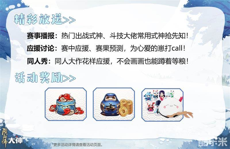 热门出战式神、斗技大佬常用式神抢先知;赛中应援、赛果预测,为心爱的崽打call;同人大作花样应援,不会画画也能蹲着等粮!此外,勾玉、金币、八岐大蛇鳞片、大吉达摩、式神召唤盒蛋、茨球、公仔……众多应援好礼,已为你准备!