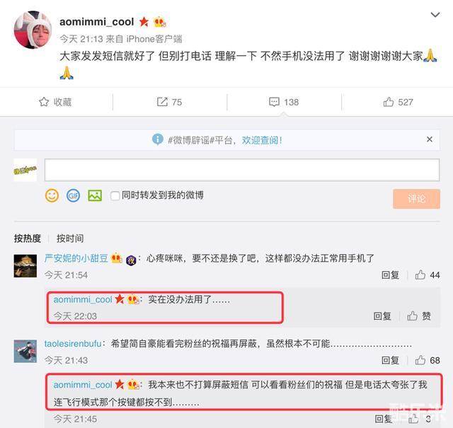 Uzi女友还表示“本来也不打算屏蔽短信,可以看看粉丝们的祝福,但是电话太夸张了我连飞行模式那个按键都按不到,实在是没法用了...”可能这次Uzi真的要换手机号了。