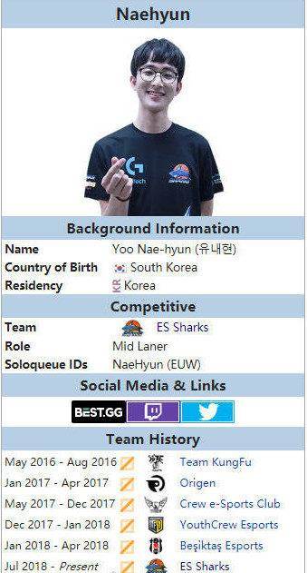 Naehyun来自LCK次级联赛,在之前还曾效力过LSPL的功夫盟、LEC赛区的OG战队、土耳其联赛、土耳其次级联赛等。
