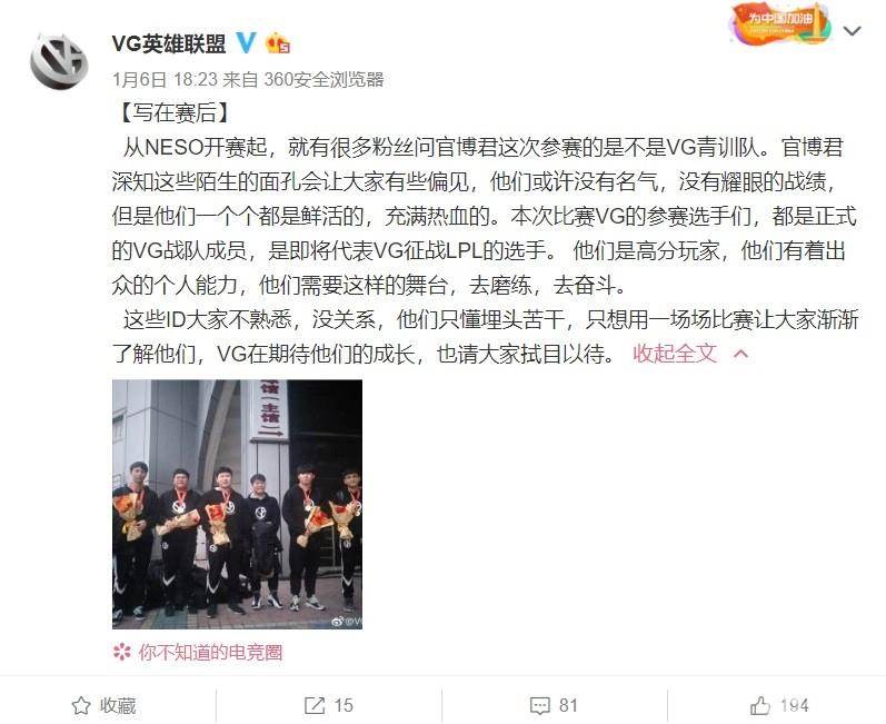 VG以这样的阵容在NESO的全国电子竞技大赛中顺利击败了OMG和SDG两支全华班,拿下了最终的冠军。按照龙哥的话来说,以一桶水来形容VG的话,之前的桶中是有污垢的,因此他选择把水全部倒掉,然后注入清水,为的就是让战队能够重新开始,完全以他的执教方向往前走。