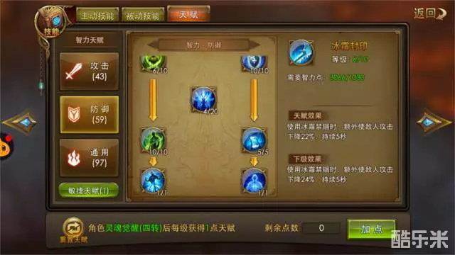 防御精通满:减少元素之拥冷却20秒,原本元素之拥有40秒冷却技能是持续二十秒的再配上寒冰之怒神兽使这个技能可以无缝连接,让法师可以无限的开盾。