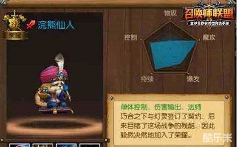 浣熊仙人身坐魔法飞毯,手持灯灵、魔杖,虽已年迈,但实力却深不可测,强大的魔法攻击力使他成为召唤师排兵布阵时最值得信赖的输出型英雄。在主动攻击敌人的同时,其大部分技能均附带击飞效果,因此,浣熊仙人与另外一位需要击飞效果才能发动加成伤害的英雄无畏剑魂,简直是绝配。