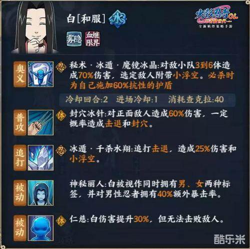 被动-神秘丽人:白被视作同时拥有男女两种标签,并对男性忍者拥有40%额外暴击率