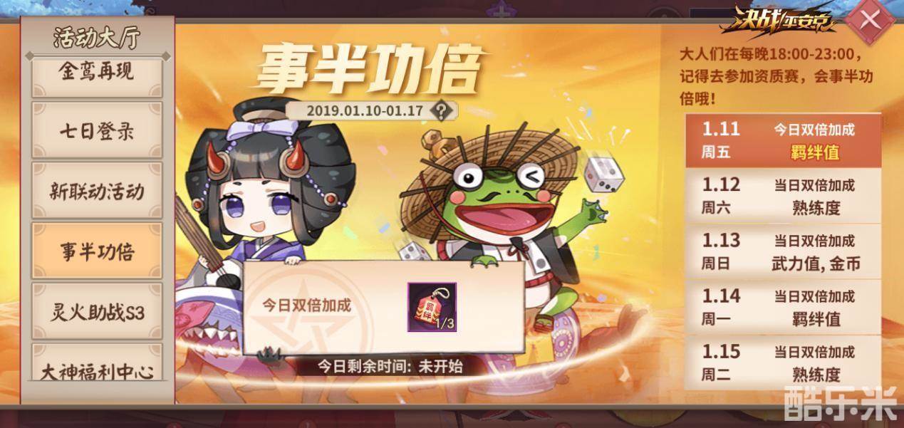 1月11日至1月17日活动期间,每晚18点到23点,各位阴阳师大人在线即可参与“事半功倍”活动,获取包括金币双倍、羁绊值双倍、武力值双倍(式神应援值)、式神熟练度双倍在内的双倍加成效果。大人们领取加成效果之后,在接下来进行的三场资质赛中,都将获得分别获得对应的双倍加成,同一天可最多拥有两种同时生效的加成效果。除了武力值双倍加成需要“战斗胜利”条件之外,其余加成效果无论输赢都可生效!