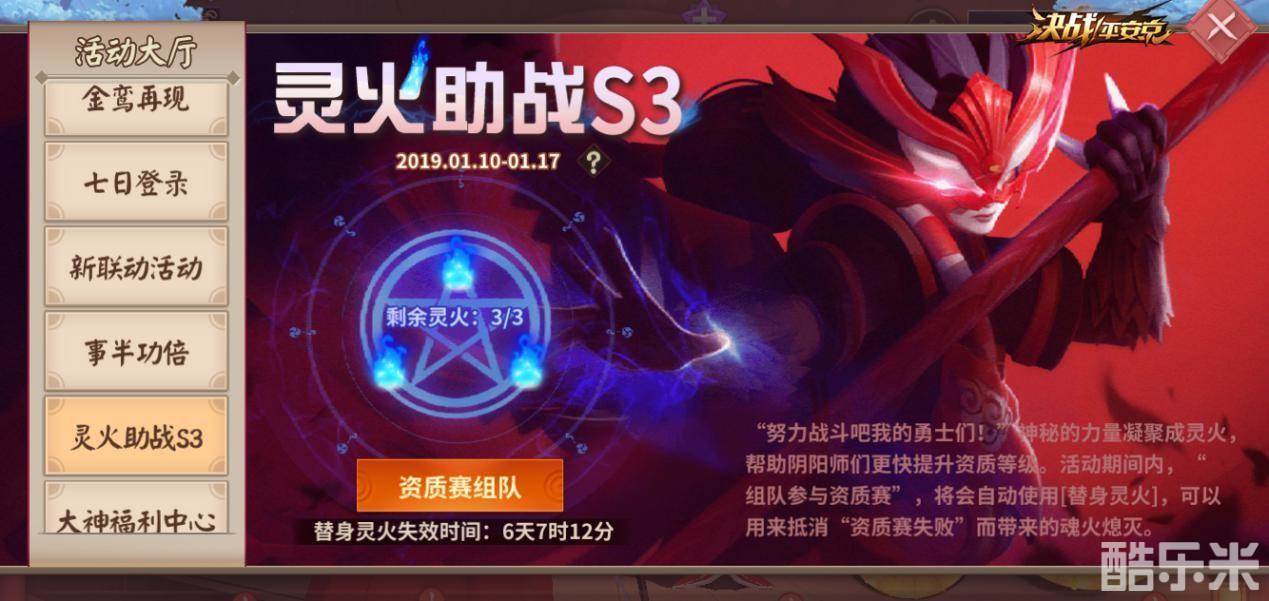 冲分之路,免不了与胜利擦肩而过的遗憾对局,为助力各位阴阳师大人们畅快上分,除了“事半功倍”的双倍福利活动,“灵火助阵”活动也将在1月11日-1月17日全天同步开放,大人们可前往活动界面领取3颗“替身灵火”,能为大人们抵挡三次灵火熄灭。