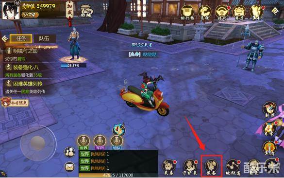 进入游戏界面后,您就可以在游戏的右下方看到一个带有装备文字和图案的图标,点击装备图标,即可进入到装备系统里查看和进行强化装备了呢。