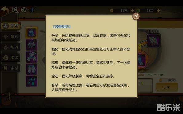 最后提醒一下,装备的升阶是基础中的基础,因为装备的品阶会直接或间接地影响到“强化”、“精炼”、“宝石”,还有开启套装效果,激活套装属性。所以一定要记得在进行装备强化操作时先把装备的品阶升上去哦~!