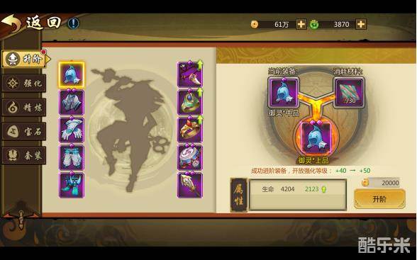 【升阶】在装备系统界面点击“升阶”,即可进入装备升阶的画面,各个部位升阶所需要的材料各不相同。具体分为“武器升阶石”、“防具升阶石”、“饰品升阶石”。升阶可提升装备品质,品质越高,装备可强化和精炼的等级越高。所以装备升阶是强化装备的必备步骤,千万别忘记进行装备升阶哦~!