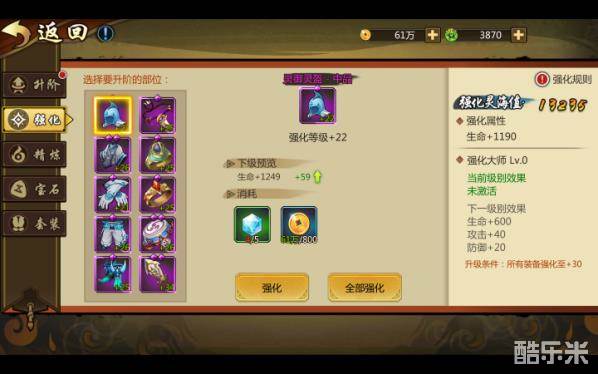 【强化】装备强化上限跟装备品阶相关,品阶越高,可强化等级越高。装备强化所需要的材料一般有“强化石”、“金币”、“高级强化石”。当全身每件装备都达到一定的强化等级时可以获得对应等级的强化大师评价,并获得大量的属性加成呢。