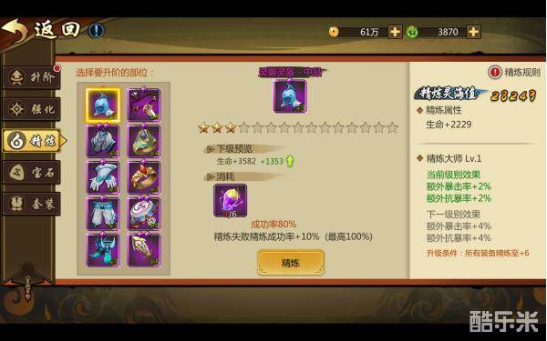 【精炼】装备品阶越高,可精炼的等级越高。精炼仅需消耗一定数量的“精炼石”,但是精炼装备会有成功率,精炼失败后下次精炼的成功率会大幅度提高,该效果可累加到最大值。当全身每件装备都达到一定的精炼等级时可以获得对应等级的精炼大师评价,并获得大量的属性加成哦。