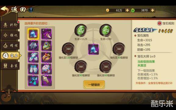 【宝石】根据装备的强化等级逐步解锁宝石孔。每个部位的装备能镶嵌的宝石也各有不同。当全身宝石的总等级达到一定的等级时可以获得对应等级的宝石大师评价,并获得大量的属性加成。