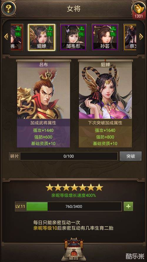 随着亲昵度等级的增加,男女武将还有机会生育多胎,带来更多属性加成。因此可得注意培养夫妻关系,送点蜂蜜杏仁露、果酸美肤、珍珠提升亲昵度自然少不了,而朝三暮四更是千万要不得。