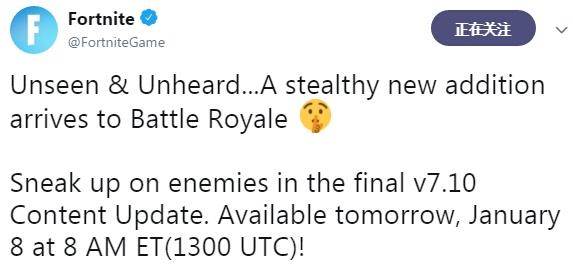早些时候,堡垒之夜官方推特发布公告,标明北京时间1月8日晚9点会进行版本更新,此次版本更新将会有一个秘密的新成员来到了PVP模式。